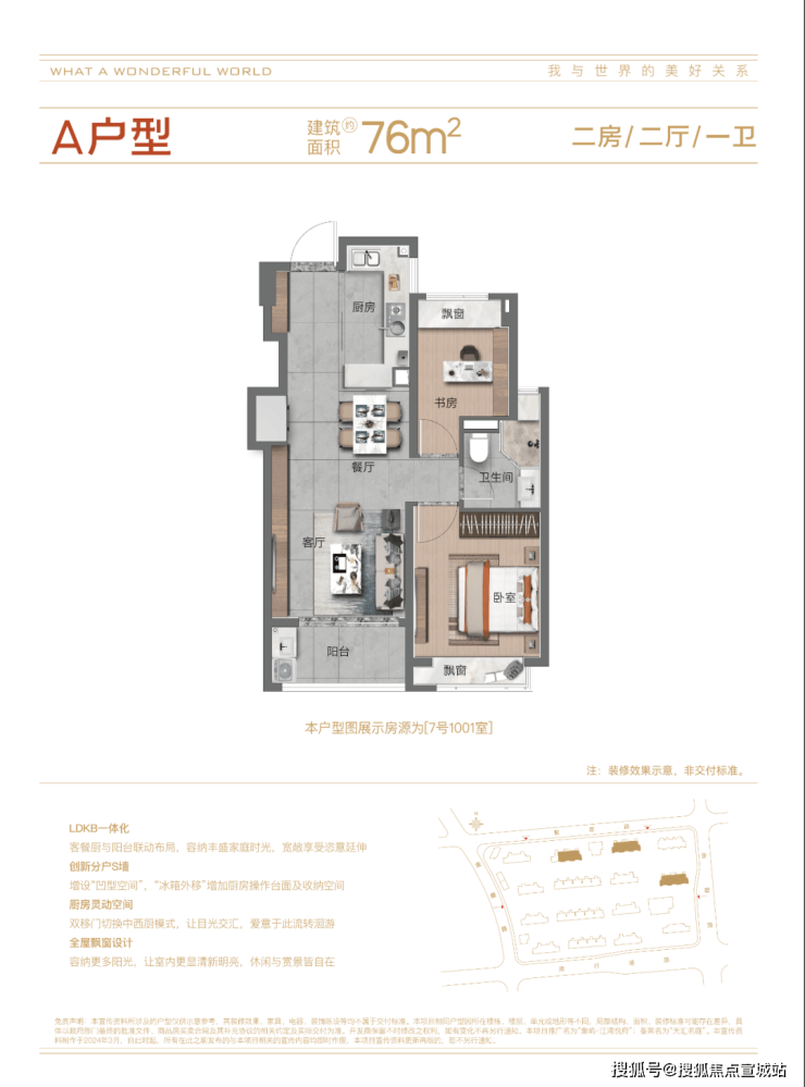 76㎡两房一卫:双开间朝南,全明通透,刚需入门,总价 210.5 万起,适配单身 / 小两口。