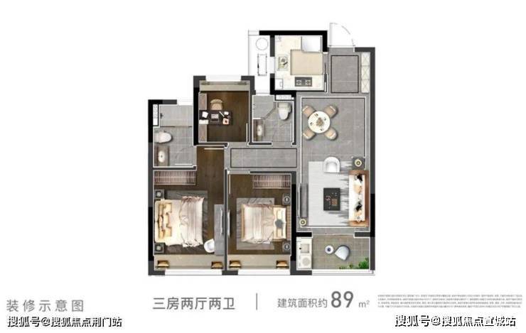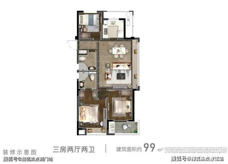 建面约96-99㎡大三房两卫,则把空间利用发挥到了极致,面积虽小,但空间有序,张弛有度。