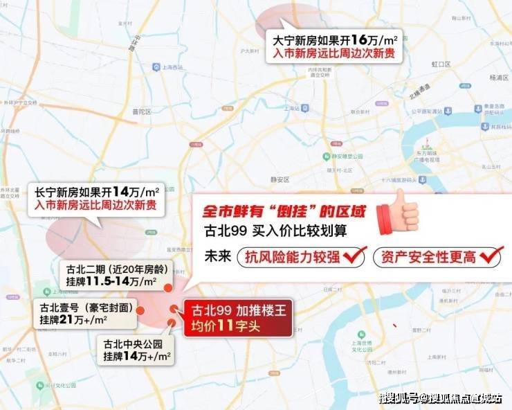 古北99售楼处电话:400-8862-334而古北二期近20年房龄,挂牌价11.5-14万/㎡,一街之隔的古北中央公园挂牌14万+/㎡,古北99甚至是全市鲜有存在“倒挂”的项目,资产安全性更高。