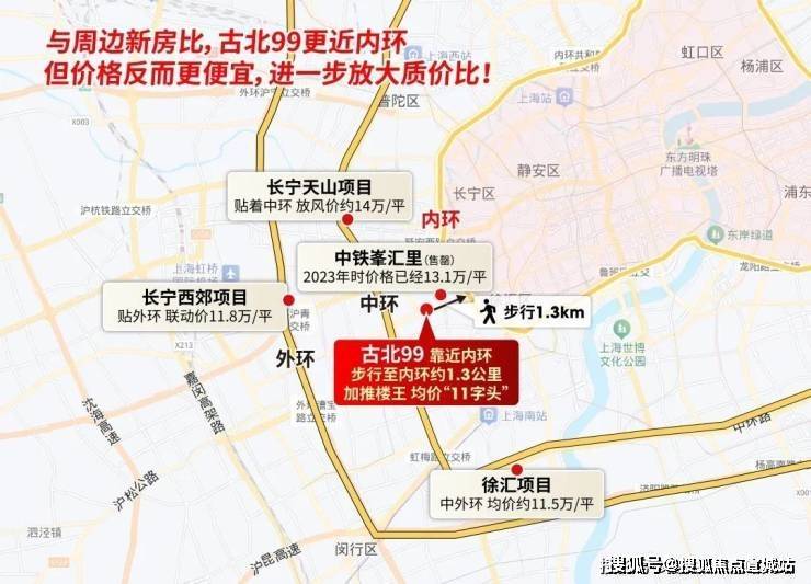 其次,古北99步行到内环只有约1.3公里,均价“11”字头,而长宁天山项目贴着中环,预计14万/㎡;长宁西郊项目贴着外环,联动价11.8万/㎡。古北99售楼处电话:400-8862-334