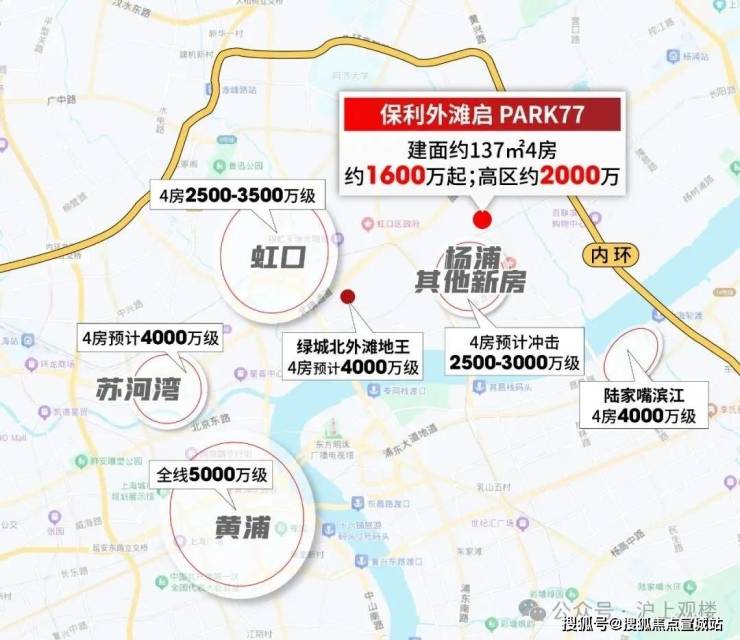 北外滩地王4房预计售价 4000万级;虹口其他新房4房价格普遍在 2500-3500万;静安苏河湾4房预计 4000万级;陆家嘴滨江4房同样 4000万级。如此对比之下, 保利外滩启PARK77高区2000万级4房的价值,可谓市中心“独一份”。