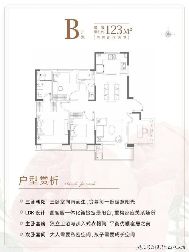 在当下100㎡及以下面积段占绝大多数的情况下,建面约123㎡4房本就十分稀缺。而在产品设计上更加符合全龄段各种家庭结构的居住需求。