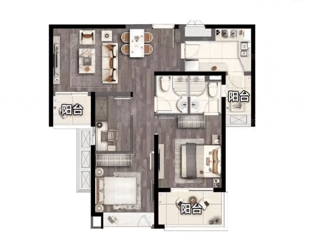 在汇景华庭的户型设计中,阳台不再是简单的功能附加,而是被赋予“空间枢纽”的战略地位。这套建面约89㎡三房两厅两卫,匠心打造三阳台格局,而且还是南向的三个阳台,实打实节省成本。