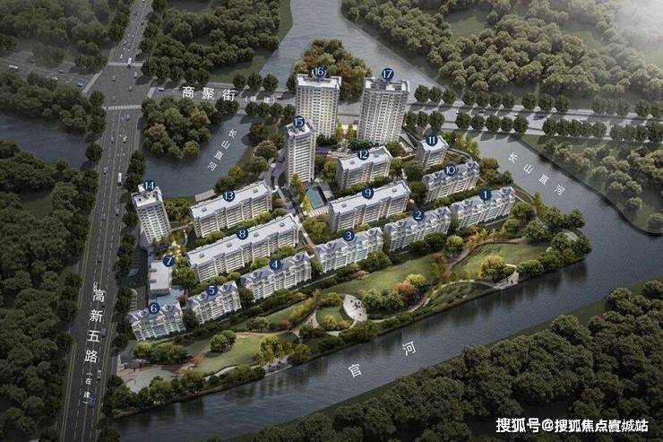项目总体布局体现为“一环、两轴、三围合”的设计构思。一环”是指连接小区主次入口的主环道以及形成小区中央的大花园,“两轴”是指贯穿小区东西和南北两条相交的主要景观轴线,“三围合”是指小区南侧有50米城市绿化带,东侧和北侧均有20米城市绿化带,三面均被景观绿化带和东侧的长山直河、南侧的官河,北侧的郎家浜河所环绕,自然景观俱佳。