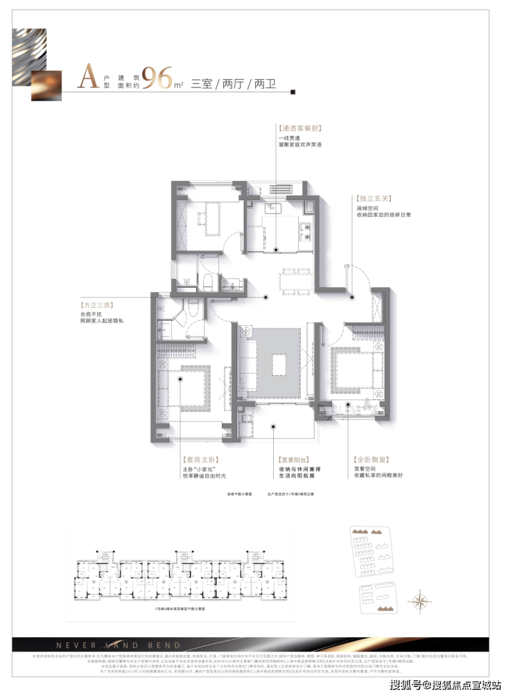 而建面约100㎡的三房两厅两卫户型,可以说是约96㎡3房的升级版,空间更加延展,整体横厅面宽约5.2米(轴中距),形成更大的南向采光面,且搭配南向观景阳台,直接做到了3.5面宽朝南,这在同类产品中是比较少见的。