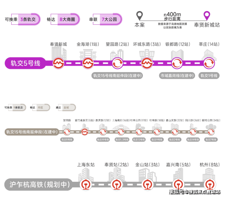交通方面:项目多轨交环绕,5号线、15号线南延伸段(在建中)、市域嘉闵线南延伸段(规划中)、沪乍杭高铁(规划中)及南枫线(在建中)