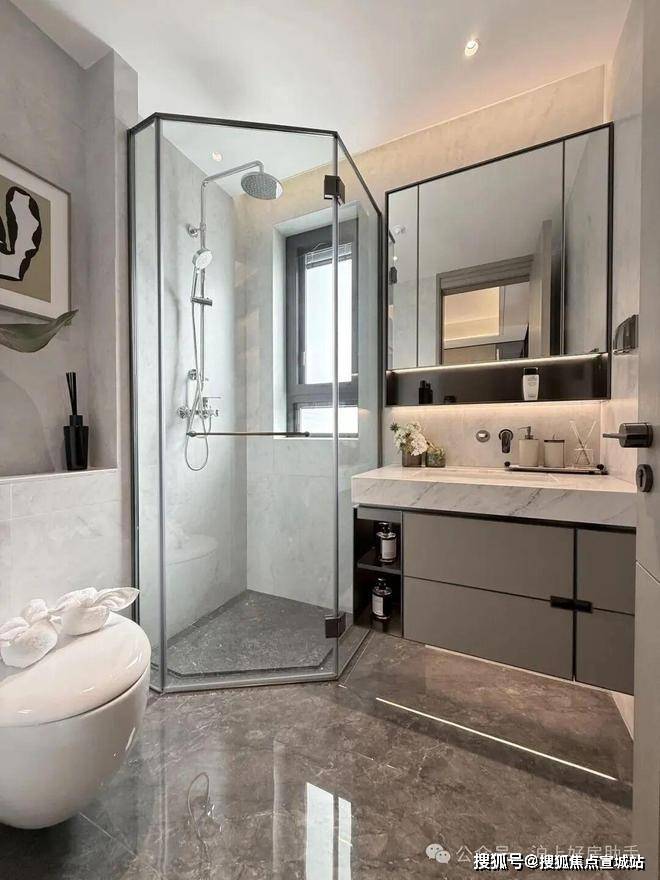 卫生间配置:选用吉博力壁挂式马桶,简约设计易于清洁,同时配备科勒品牌花洒龙头及五金件,保证使用的舒适性与耐用性。✅✅张江金茂府售楼处电话:400-8862-334✅✅台盆柜、镜柜及玻璃淋浴房均为金茂定制,从材质到设计,无不透露出对精致生活的追求。