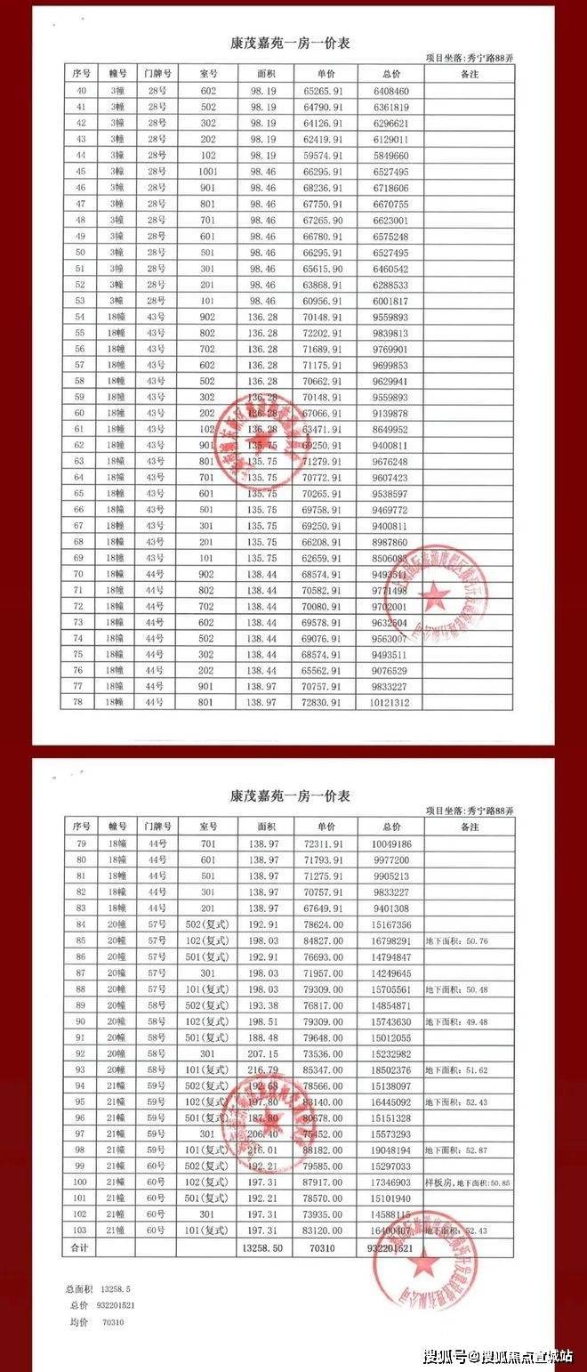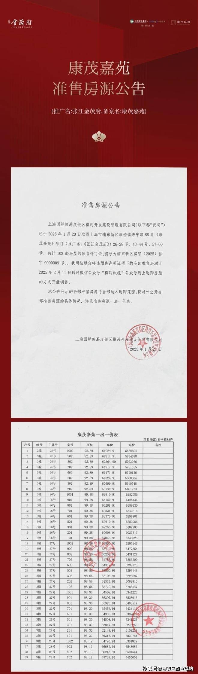 张江金茂府项目一房一价表▼