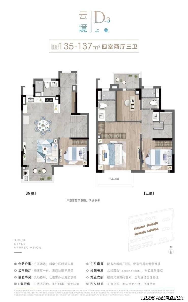 建面约142m²上叠,既实现了不同平层与普通高层的墅质体验,又简化传统别墅的复杂动线,以及频繁走动带来的不变,利用了空间,更能够科学地进行功能分区。