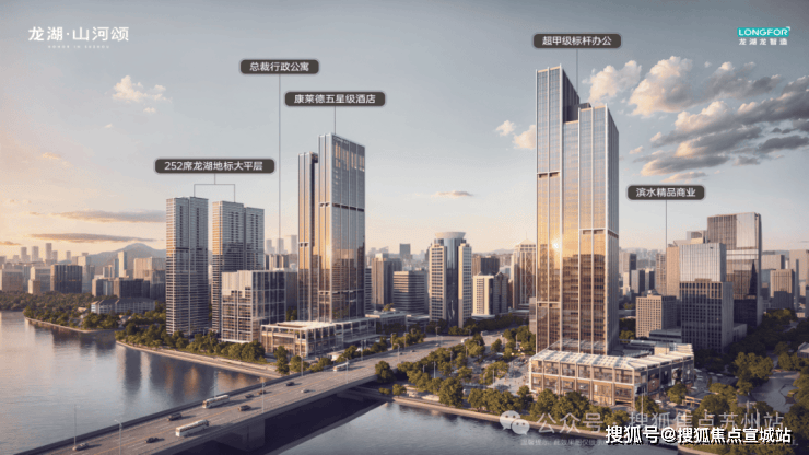 集5A超甲级写字楼、苏州首个康莱德酒店、天际顶奢大平层、COE总裁行政公寓、滨水商业街,多种业态于一身,承载苏州塔尖的生活向往。