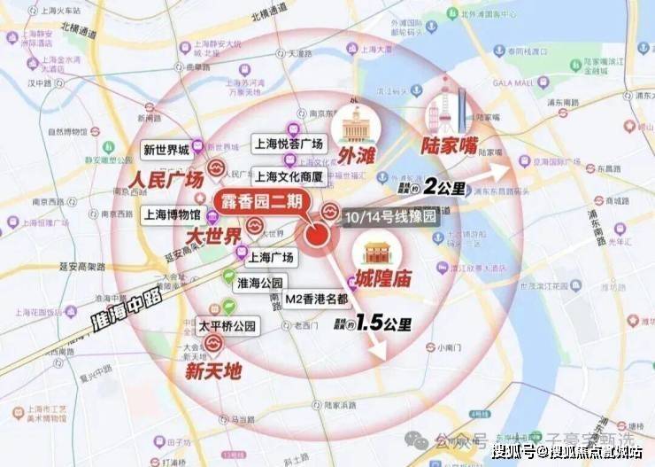 作为上海的绝对市心,露香园直线距离人民广场、淮海路、外滩、豫园等上海市地标性区域均不超过1.5公里,距离陆家嘴直线约2公里。