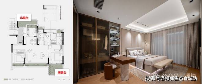 A户型为南北双露台的设计,主卧连接大露台,这里可以是瑜伽区、观景台又或是早咖晚酒等私人个性场域,完全满足自在生活~