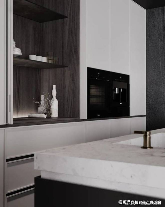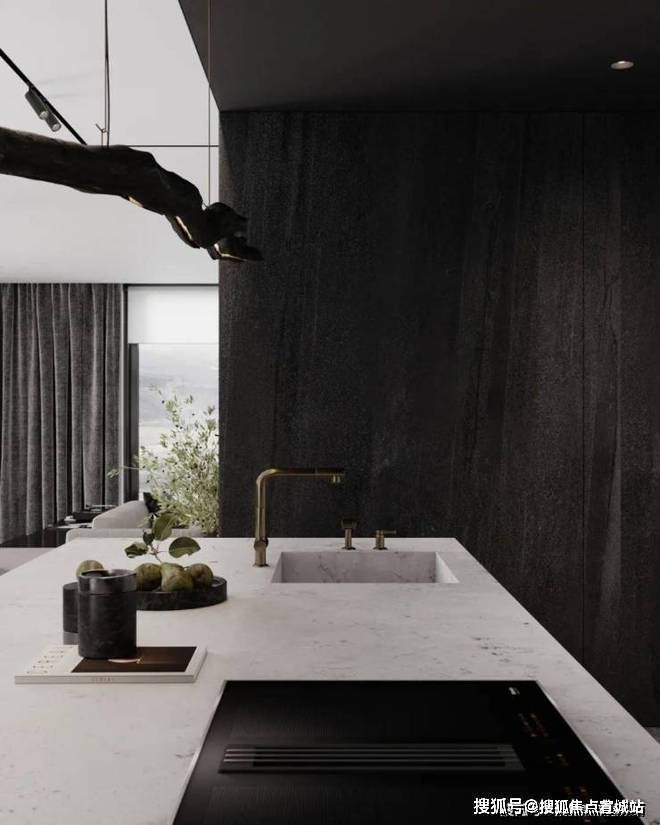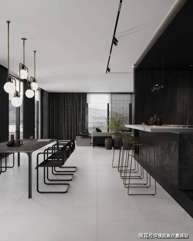 餐厨的设计仿佛是一件艺术品也像是一间高档的餐厅。线条简单带点工业风的设计。开阔的餐厨,一体化的格局增添了视觉的延伸效果。