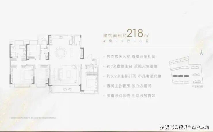 建面约218㎡户型:4室2厅3卫的顶配设计,拥有独立家政间和双套房设计,客厅与餐厅形成LDK一体化空间,连接约8米宽景观阳台,主卧配备独立衣帽间和豪华主卫