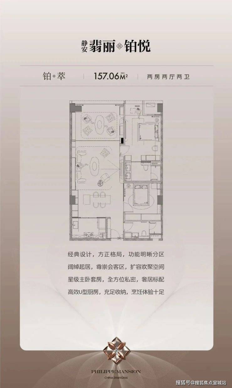 【铂萃】建筑面积约157.06㎡2房3厅2卫经典设计,方正格局,功能明晰分区阔绰起居,尊崇会客区,扩容欢聚空间星级主卧套房,全方位私密,奢居标配高效U型厨房,充足收纳,烹饪体验十足