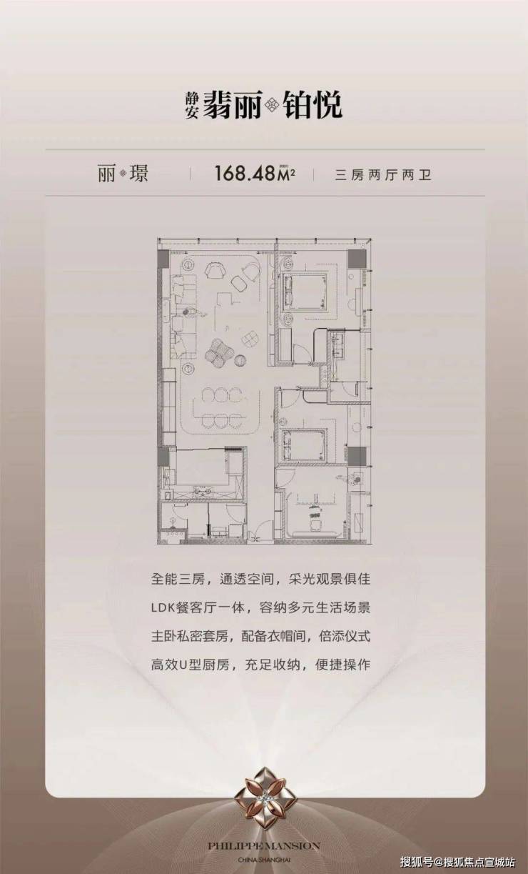【丽璟】建筑面积约168.48㎡3房2厅2卫全能三房,通透空间,采光观景俱佳LDK餐客厅一体,容纳多元生活场景主卧私密套房,配备衣帽间,倍添仪式高效U型厨房,充足收纳,便捷操作
