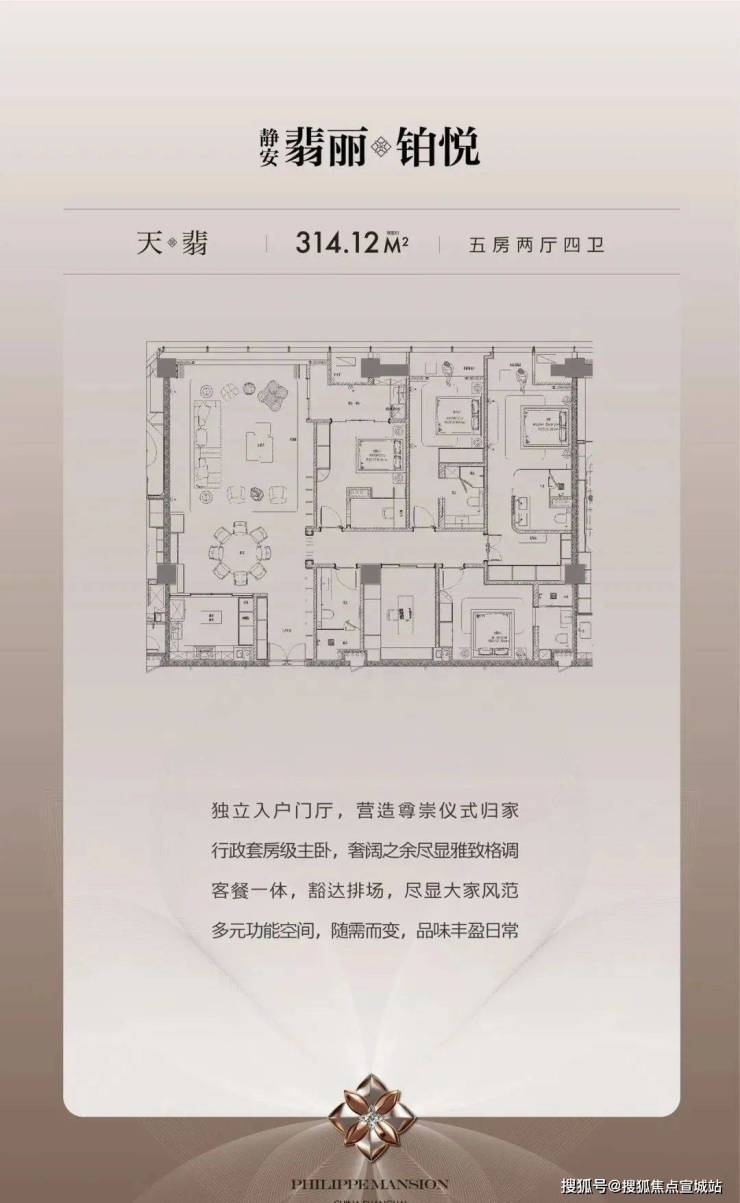 【天翡】建筑面积约314.12㎡5房2厅4卫(3套房)独立入户门厅,营造尊崇仪式归家行政套房级主卧,奢阔之余尽显雅致格调客餐一体,豁达排场,尽显大家风范多元功能空间,随需而变,品味丰盈日常