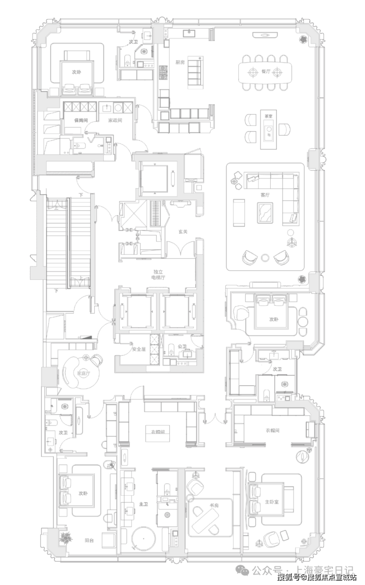 约600㎡户型是6房带4套房,完整满足了居住在平层的所有功能空间需求。主卧套房,搭配有专属书房,总体空间接近150㎡,本身就是一间豪华公寓,同时带有男女主人双重衣帽间,是真正能够享受到别墅级的居住尺度。衣帽间、卫浴间、主卧都是肉眼可见的奢侈。