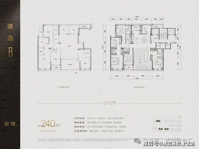 约240㎡南厅户型。该户型分布于12-16层的低密楼栋,一梯一户的尊贵体验,综合得房率约达90%以上。其最大亮点在于南向布置了三间卧室,其中两间为套房,在保障多房间需求的同时,客厅仍实现了约6.4米的宽尺度开间,并衔接进深约3.05米的超大阳台,完美兼顾采光、视野与实用功能。