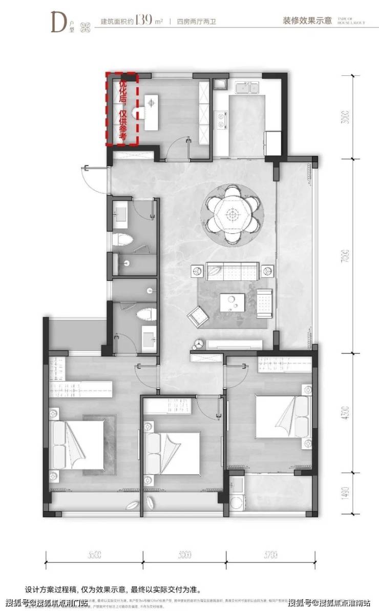 建面约139㎡四房两厅两卫户型,起步首付约55万,预算充足建议首选.