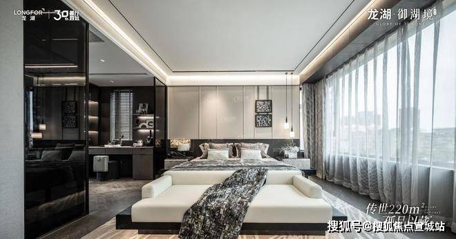 空间统治力:约16米南向面宽(四开间朝南),搭配“总统式”主卧套间,主卧套房配备270°转角飘窗,尺度比肩200㎡+产品;