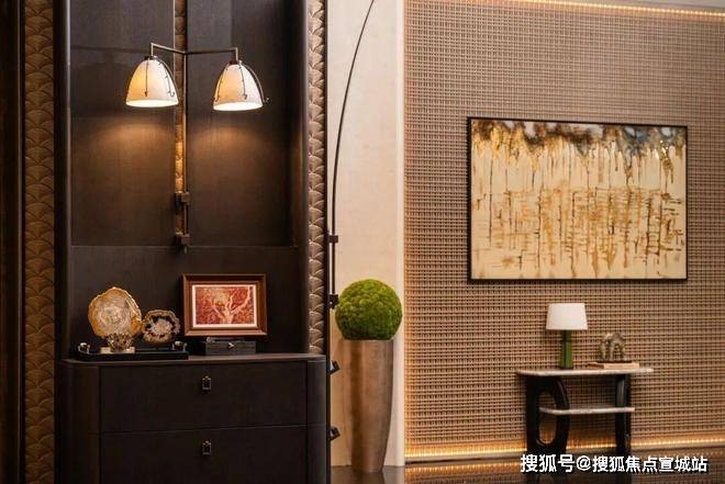 仪式感营造:独立电梯厅延伸至玄关廊,香槟金金属线条勾勒归家仪式感;