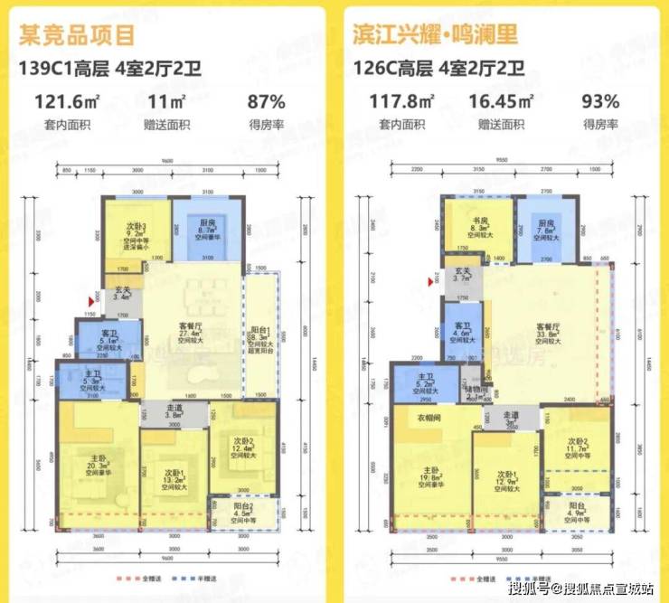 以项目约126㎡C户型为例,其整体格局与相邻竞品约139㎡户型格局高度相似,均为三开间朝南+横厅设计。