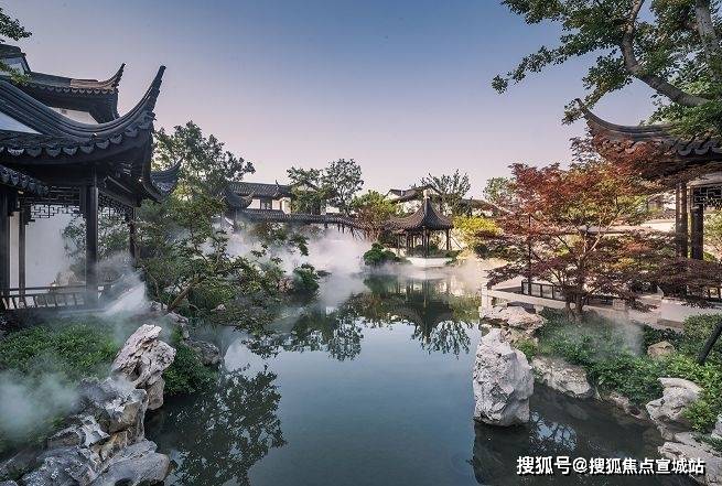 园内设置七处景观组团,以中国各大古典名园为借鉴,并融入宋代的雅致生活韵味。宋式园林更强调“精而造疏,简而意足”,擅以意山水画为蓝本、以画设景,诗词为主题。步履其中,移步换景,步步生趣。花园组团规模扩大,户户有景,各自成趣,或临廊听雨,或观亭赏风,居住更为诗意。