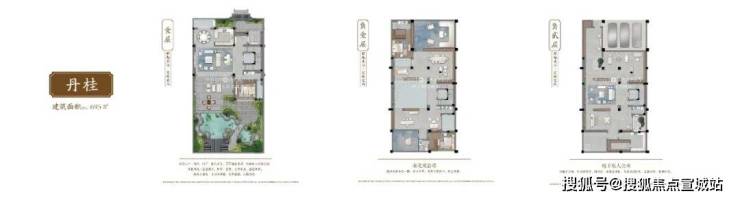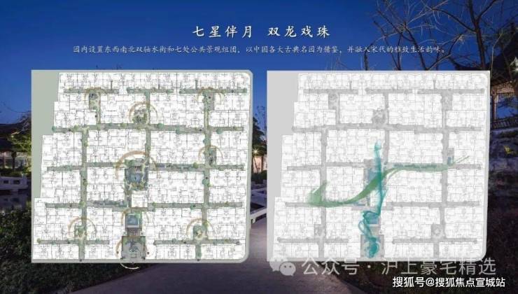园内布局五进制南北主轴、以及“双龙戏水”格局的双水街,巷道联通,设七大景观组团,形成“一环、两轴、七境”布局。175席中式园宅,依巷分布南北,横平竖直,秩序井然。