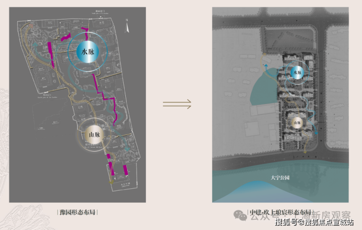 社区内部,设计团队以豫园为灵感蓝本,运用现代手法重新诠释豫园的“山脉”与“水脉”,打造出一座立体起伏的山水园林。