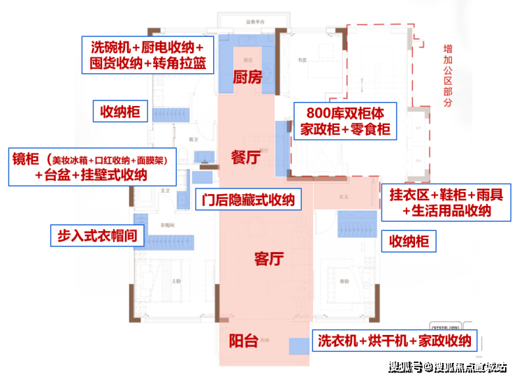 1、精细化收纳系统:全场景收纳,卫生间镜柜内含美妆冰箱、房门后有家政收纳空间、厨房的小家电区、衣帽柜收纳等等,这些一起解决了家庭的大部分收纳问题。