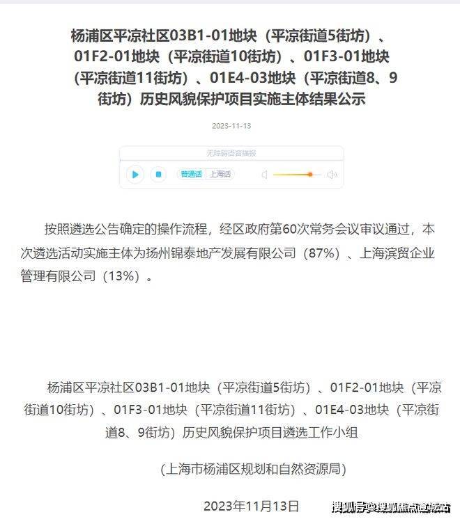 2023年12月,中信泰富(87%)联合杨浦国资(13%)通过协议出让,以总价1143905万元,楼面价63127元/m²竞得4宗打包地块:杨浦区平凉社区03B1-01地块(平凉街道5街坊)、01F2-01地块(平凉街道10街坊)、01F3-01地块(平凉街道11街坊)及01E4-03地块(平凉街道8、9街坊),总建筑面积18.1万㎡。(其中住宅建筑面积11.3万㎡,办公建筑面积5.2万㎡,商业建筑面积1.6万㎡)