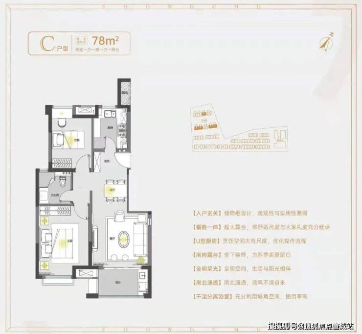 建面约78㎡2房1卫户型,做到了双开间朝南+南北通透+卧室带飘窗+动静分离,功能区划分、动线都非常清晰。