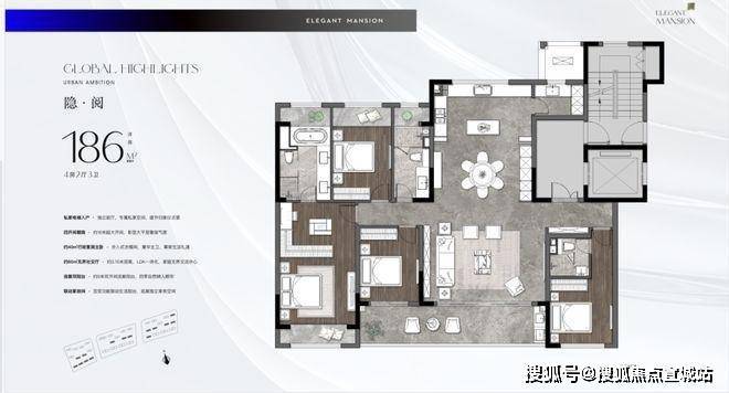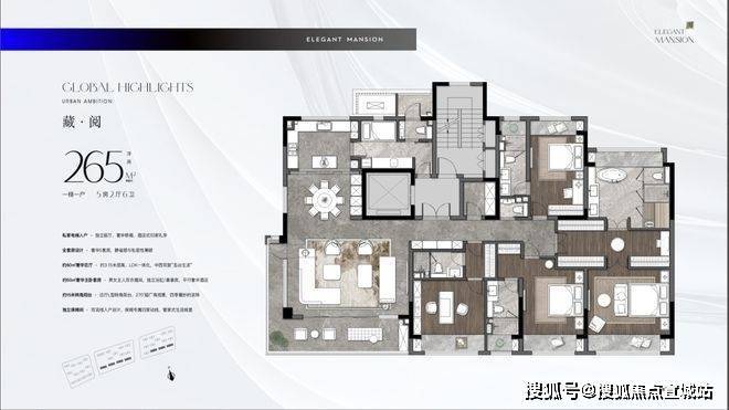 户型特点:130㎡户型为四房两厅两卫,全明设计,南北通透,5.7米超大宽厅;150㎡户型四房两厅两卫,私家电梯入户+独立入户玄关,约5.6米横厅+面宽约8.6米观景阳台;186㎡户型四房两厅三卫,私家电梯入户搭配独立入户玄关,净深约2米、宽约9米景观阳台,联动面积约55㎡的LDK公区;265㎡户型五房两厅六卫,有270°转角阳台,5个套房设计,包含独立家政间和保姆房。