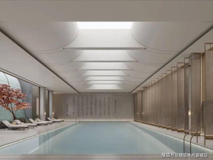 三进 青漪园:青漪园是核心庭院,它围绕着“水”展开,体现了青浦“水文化”的特点。一座隐桥从水面延伸而出,由瀑布连接直至下沉庭院,为室内游泳池提供了良好光线和隐谧美景。