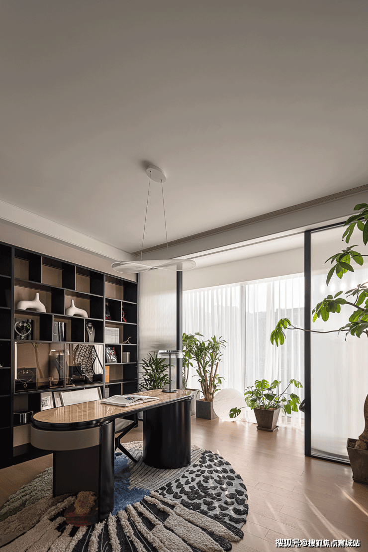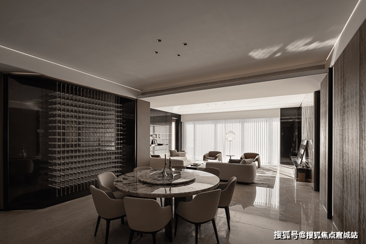 空间在材质搭配上,也是极尽雅奢可能。鱼肚白岩板打造的大岛台,营造温情的社交一隅;木饰面与金属软硬质感的碰撞,有序的墙面分割把握了整体空间的节奏感;双背景墙分别由鱼肚金岩板和劳伦黑金色系展墙组成彰显奢华。