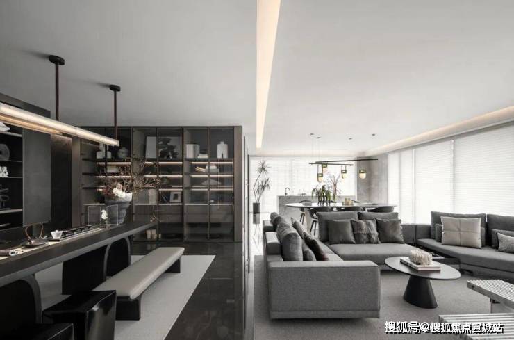 作为杭州最早的大型居住区之一,在首层入户大厅公区,以钛金板+背景墙石材+木格栅的组合,延续着宝格丽一贯富有格调的装修风格。唐忠汉先生非常倡导场域中心论,他通过LDK一体化设计新趋势,让整个开放空间形成了室内的场域中心,尽享景观视野的同时,也就是社交空间。