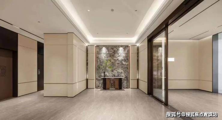 金色飘檐擦亮辨识度,南立面以大面玻璃主打,白、金、蓝灰为主调,配合部分涂料;基部用上了贝金米黄大理石,温润如月光。