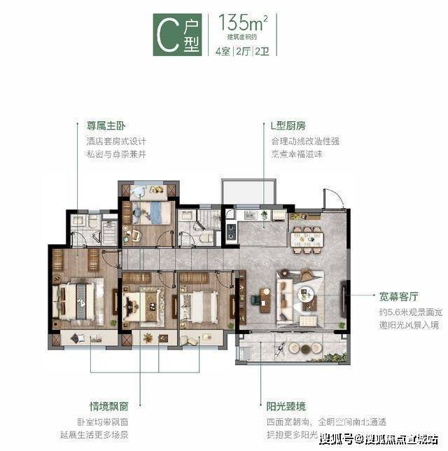 户型设计:建面约99-135㎡全双卫户型,配置中央空调、新风系统,严选一线家装品牌,如方太油烟机、大自然地板、科勒智能马桶盖、美的中央空调等。