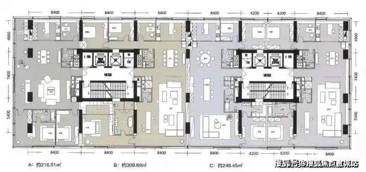 主力户型:建面约 201-581㎡大平层,主力户型集中在 260-350㎡之间,还有平层贯通 1100㎡,上下连通 2200㎡的户型。