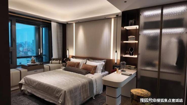 北次卧略小了些,带L型飘窗;南次卧也是套房设计,预留下水,可以做个“半卫”,比较适合长辈居住,不做卫生间做衣帽间储藏间也是可以的。