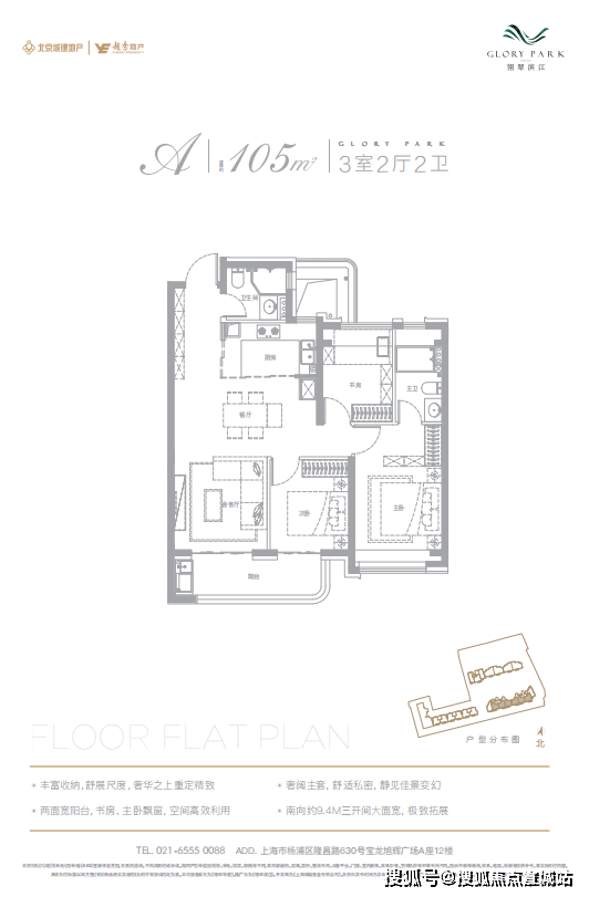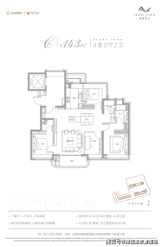 价格:二批次推售均价约 10.5 万 - 11 万 /㎡,主力户型中 105㎡三房产品总价约 1000 万,143㎡四房约 1300 万起售。