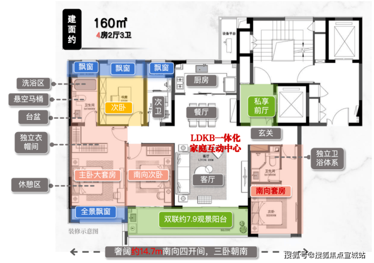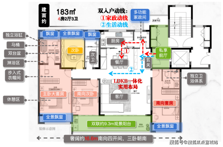 空间创新:部分户型配备270°转角观景阳台,南向双套房设计