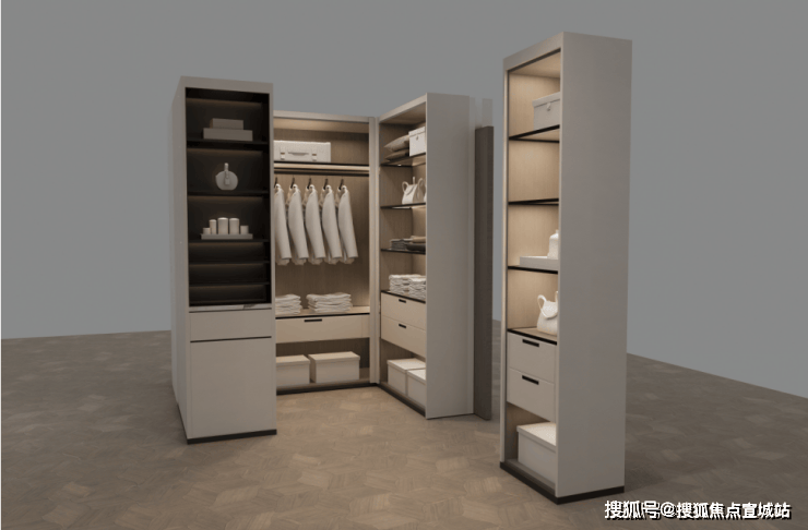 主卧和约99平户型一样,衣柜更大形成衣帽空间,还交付有半开放式、类似于酒店的迷你吧设计: