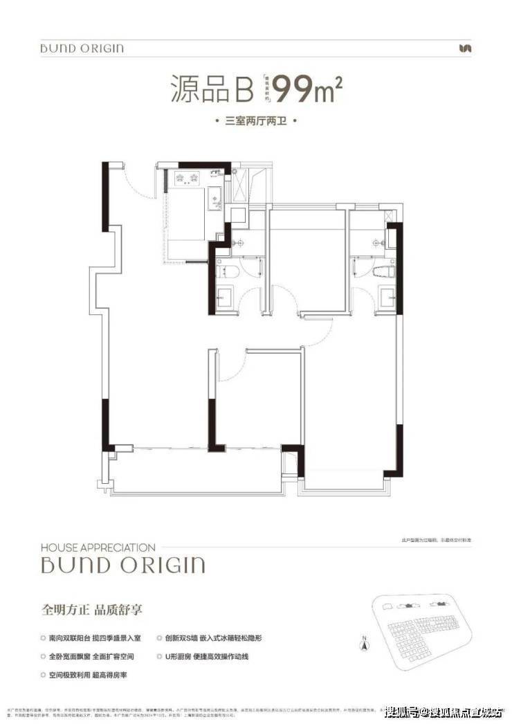 建面约99㎡3房2厅2卫,非常标准的动静分离、三开间朝南户型。