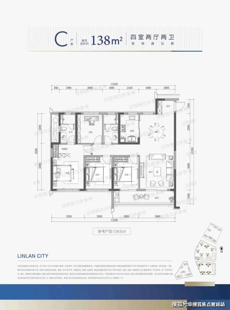 建面约138方户型: 138㎡四房两厅两卫边套户型,则适合改善家庭的需求。空间格局动静分区,三个南向卧室,做到了「阳光平权」。卧室与客厅一同实现了四开间朝南,南向面宽超13米,同样也规划有双开间的「跑道阳台」。