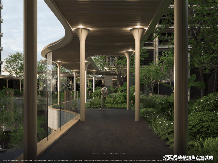 林岛漫步围绕中央景观,以现代艺术手法,打造森林岛屿景观循水归岸呼应外部天然水系,内部设置特色水景,串联不同节点闲庭雅致以树木、水系与局部连廊体系融合,共同组建起社区与居所之间的联通介质。