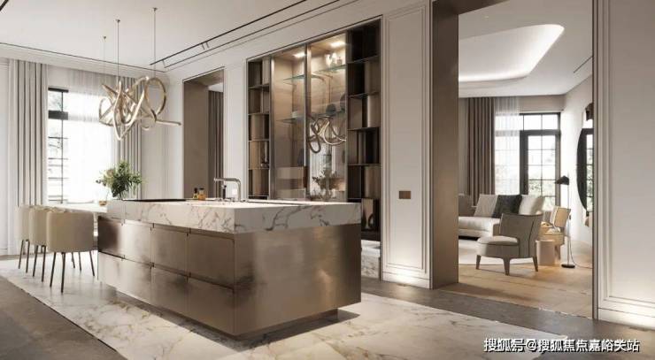 在厨房的设计中依然沿袭客厅的设计采用大理石元素,通过金属元素与大理石元素的结合来表现空间的轻奢,其中金属的岛台加上大理石台面让空间极具氛围感,让空间看上去更有层次.