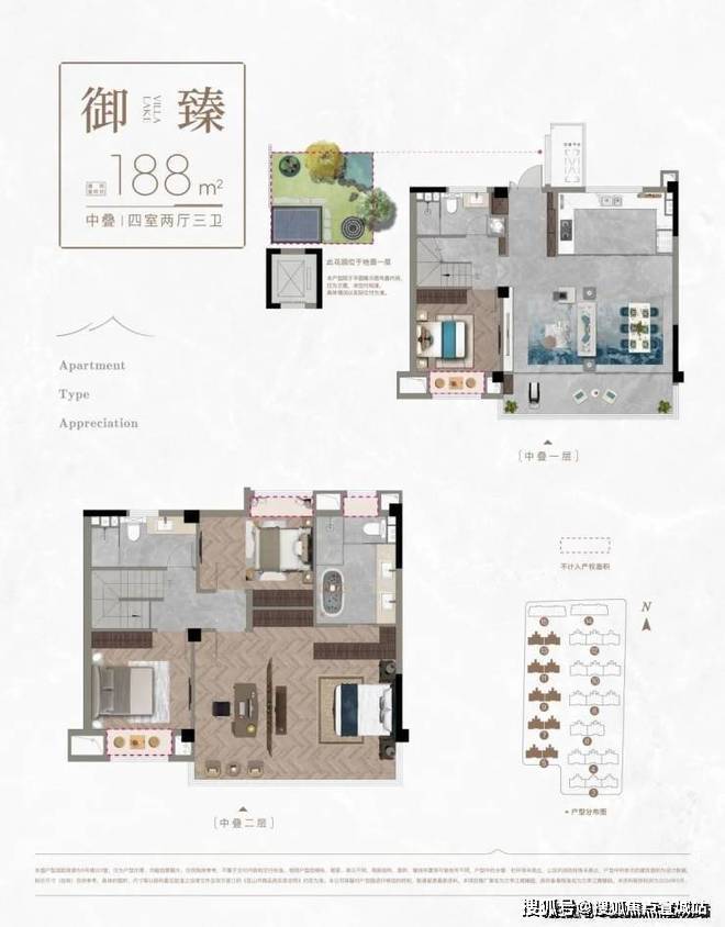叠墅:面积约 168-236㎡,均为四房设计。上叠产品赠送露台,中下叠产品赠送花园。