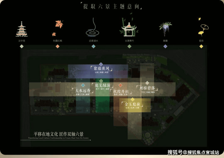 项目园林对轴线的运用同样出彩,堪称神来之笔的“双轴六境”,由“礼序归家轴+景观漫步轴”纵横交织,融在地文化,以“非遗”竹编形制,铺陈园林步道,同步淬取“州桥壁落”、“紫藤熏风”、“天水远香”等嘉定古今6景,提炼细节元素及专属色系,营造主题园林空间。